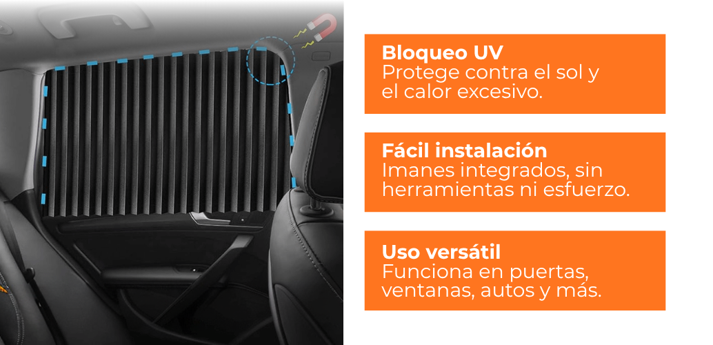 ✓ Diseño magnético inteligente – Se adapta con precisión a las ventanas del carro para bloquear el sol sin estorbar ni dañar.